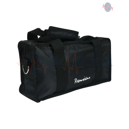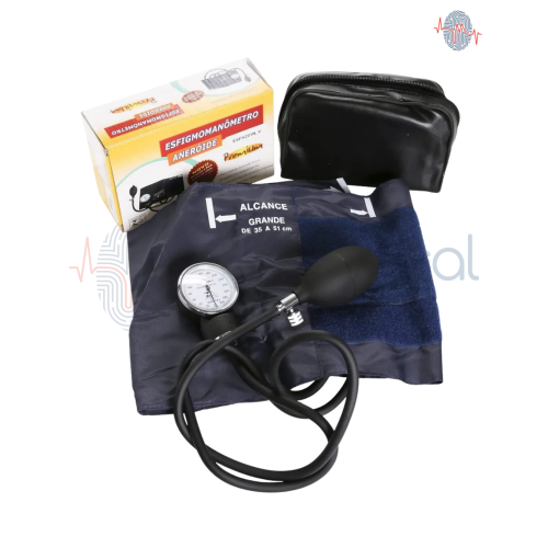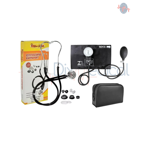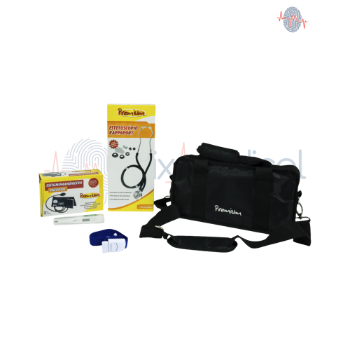 Um Estetoscópio Rappaport na cor preta completo com acessórios. Um Esfi gmomanômetro Aneróide completo com braçadeira tamanho adulto em nylon com fecho de contato na cor preta . Um Termômetro clínico digital branco. Um Garrote tamanho adulto. Prática Bolsa multi-uso em nylon com fecho de contato da cor preta.